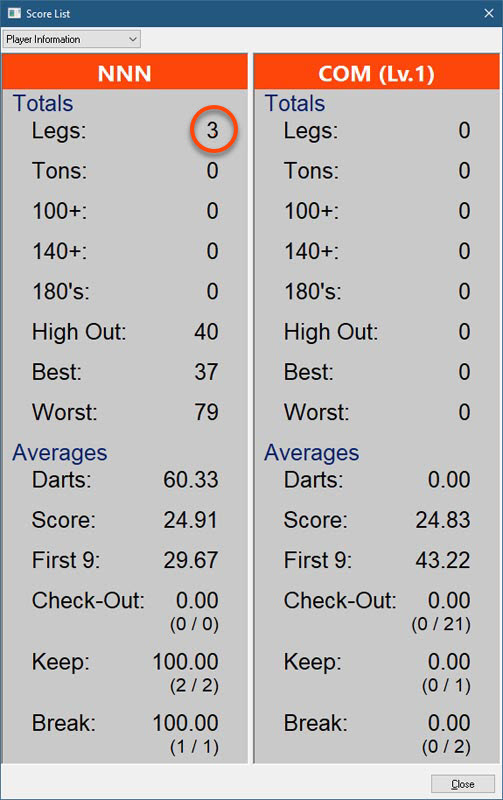 Es war schön jetzt endlich eine Stufe höher zu spielen. Aber da weht schon ein anderer Wind. Mit den Punkten könnte ich je nach Tagesform noch mithalten. Aber beim Checken muss ich dann noch einiges besser werden. Da schlägt der Computer, wie ich gleich im ersten Spiel erfahren musste, erbarmungslos zu - auch mit 0:3. Und das mit 9 Würfen weniger.
