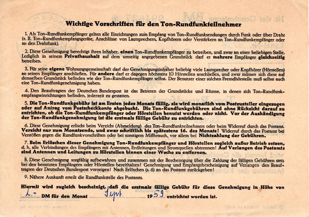 Früher™ da gab es noch andere Gebühren. Ich habe hier eine Ton-Rundfunkgenehmigung aus dem Jahre 1959. Zu dieser Zeit hatte man ein Radio, aber ein Fernsehgerät hatten nur die wirklich Reichen.