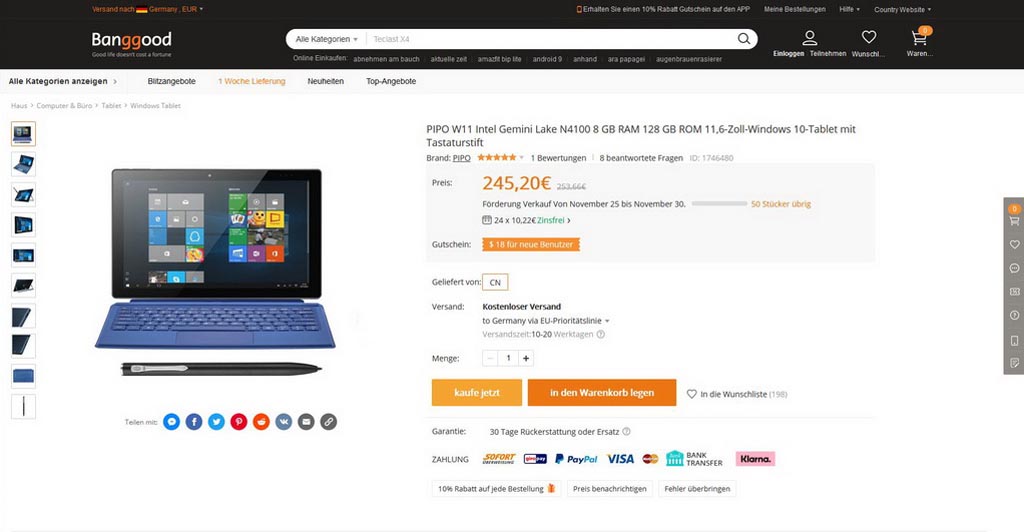 Was dabei zu beachten ist, dass auf den Preis der angezeigt wird, noch die deutsche MwSt. kommt. Und evtl.kommen auch noch Zollgebühren dazu. In meinem Fall beim Kauf des Tablets kommen keine Zollgebühren obendrauf.