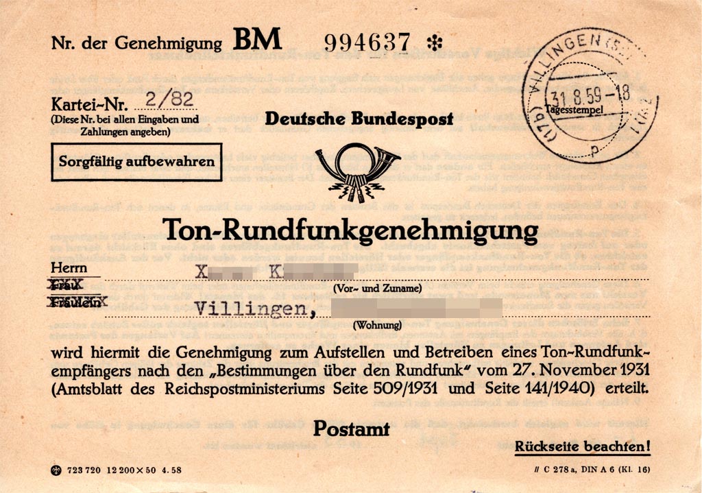 Früher™ da gab es noch andere Gebühren. Ich habe hier eine Ton-Rundfunkgenehmigung aus dem Jahre 1959. Zu dieser Zeit hatte man ein Radio, aber ein Fernsehgerät hatten nur die wirklich Reichen.