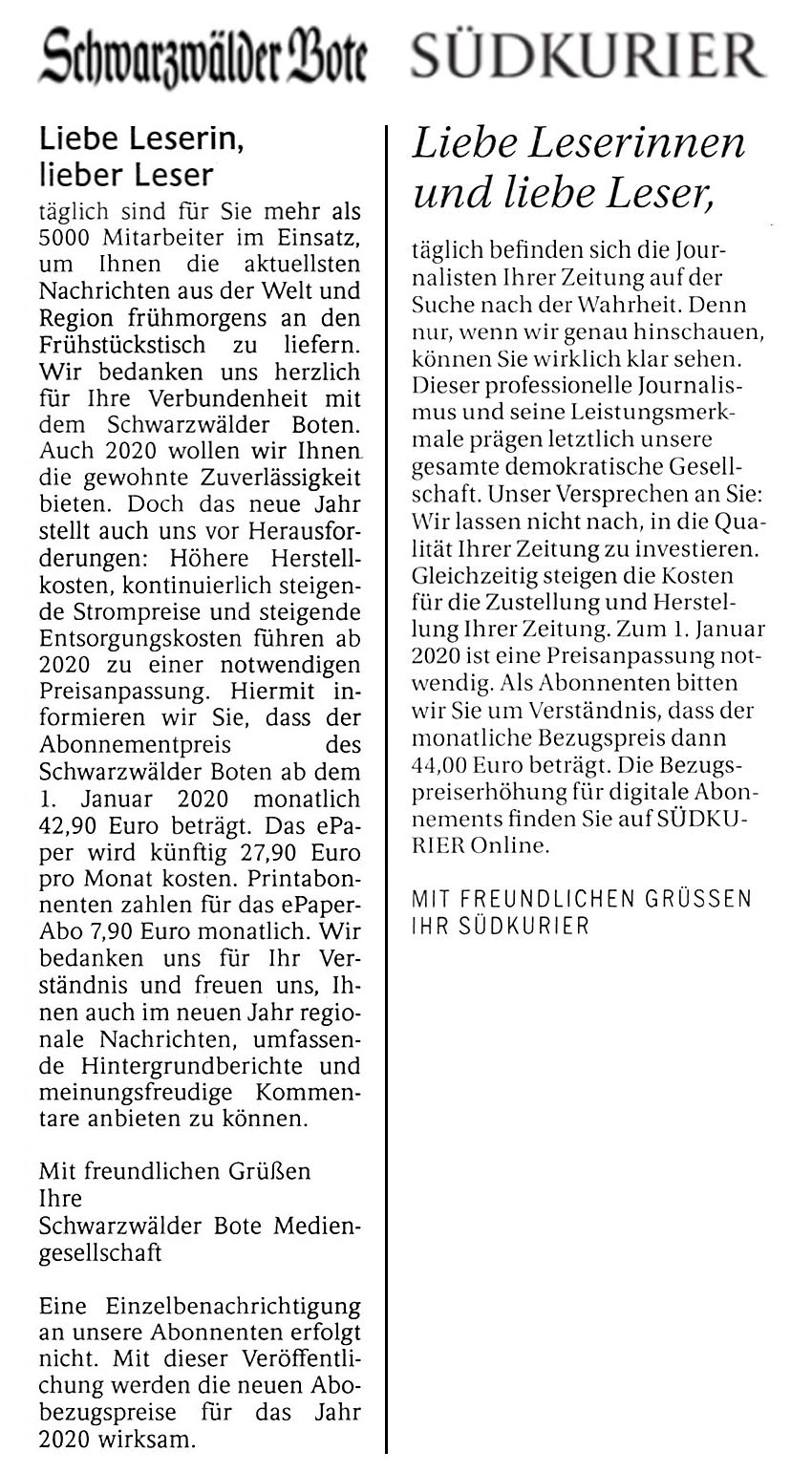 Wieder einmal berichten wir hier über unsere Mitbewerber. Beide Zeitungen haben für das neue Jahr eine Preiserhöhung angekündigt. Die einen begründen es mit höheren Herstellungskosten, steigenden Strompreisen und steigenden Entsorgungskosten. (Schwarzwälder Bote) Der andere Mitbewerber (Südkurier) begründet es mit professionellem Journalismus, d.h. in die Qualität der Zeitung zu investieren. Außerdem werden auch die Kosten für die Herstellung und die Zustellung angeführt. |