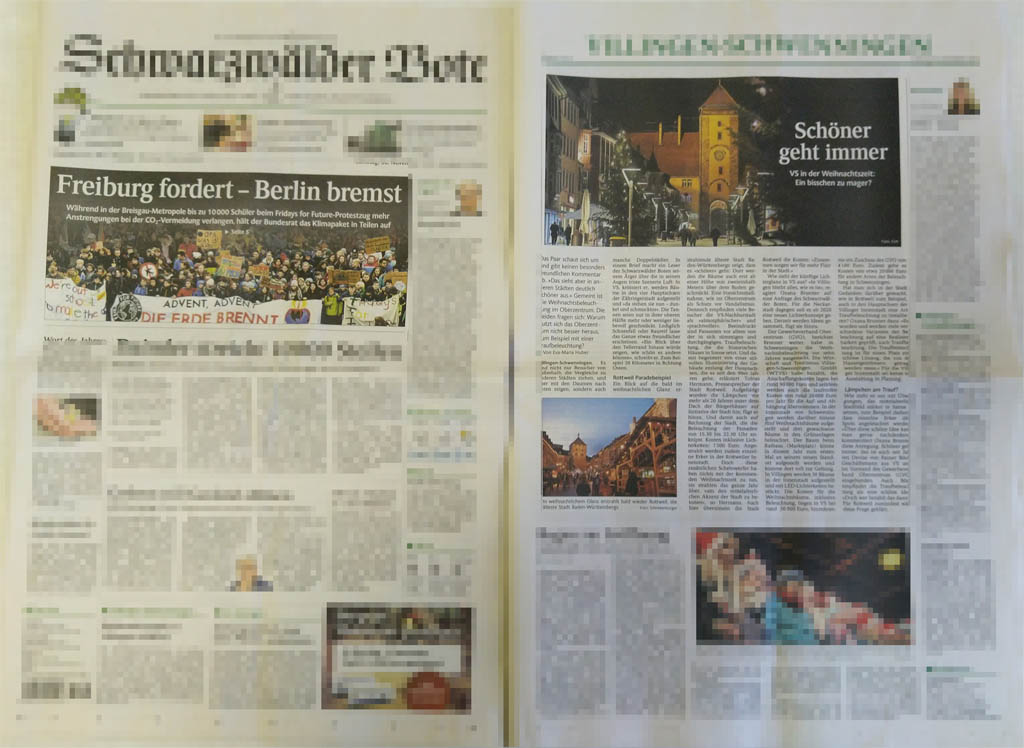 Heute war es mal wieder Interessant zu sehen, wie unsere Welt voll mit Widersprüchen ist. Auf der Titelseite des Schwarzwälder Boten, werden protestierende Schüler der Aktion Friday For Future gezeigt. Im Regionalteil wird lamentiert, dass die Weihnachtsbeleuchtung nicht so schön illuminiert, wie in Rottweil.