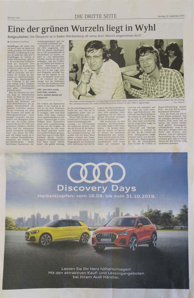 In der heutigen Ausgabe des Schwarzwälder Boten war in der Rubrik "Die dritte Seite" folgendes zu lesen, bzw. zu sehen. Satire, Ironie, Sarkasmus. Wer kann es einordnen? Berichtet wurde über die Gründungszeit der Grünen und darunter Werbung von einem Autohersteller aus Ingolstadt. Besser geht es nicht.